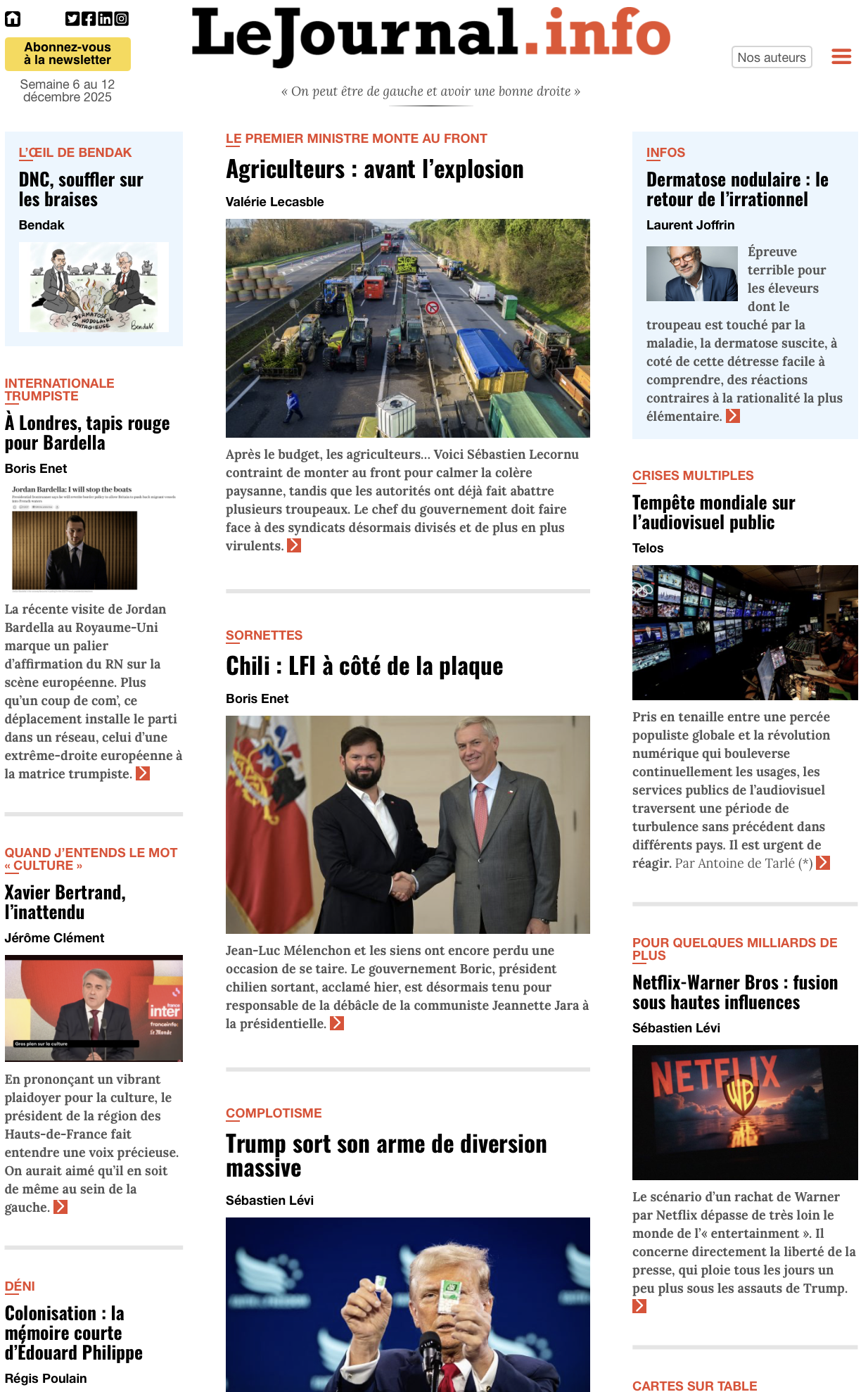 Après le budget, les agriculteurs… Voici Sébastien Lecornu contraint de monter au front pour calmer la colère paysanne, tandis que les autorités ont déjà fait abattre plusieurs troupeaux. Le chef du gouvernement doit faire face à des syndicats désormais divisés et de plus en plus virulents. Lire l’article