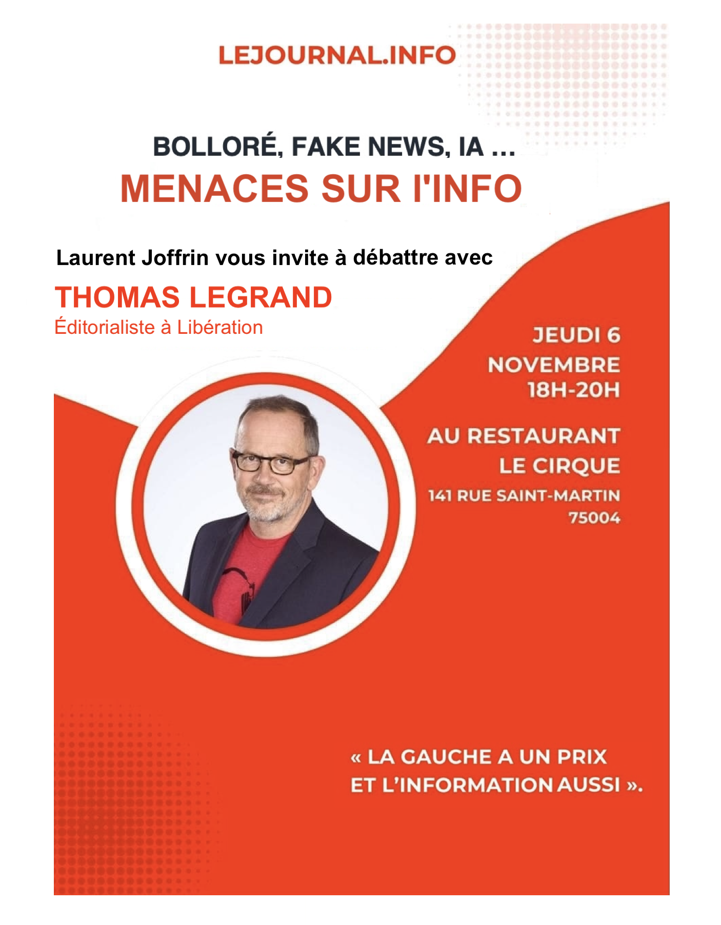 Laurent Joffrin et Lejournal.info seront heureux de vous retrouver jeudi 6 novembre à 18 h pour débattre autour de Thomas Legrand, éditorialiste à Libération, au restaurant Le Cirque dans le 4 ème arrondissement de Paris (entrée gratuite).